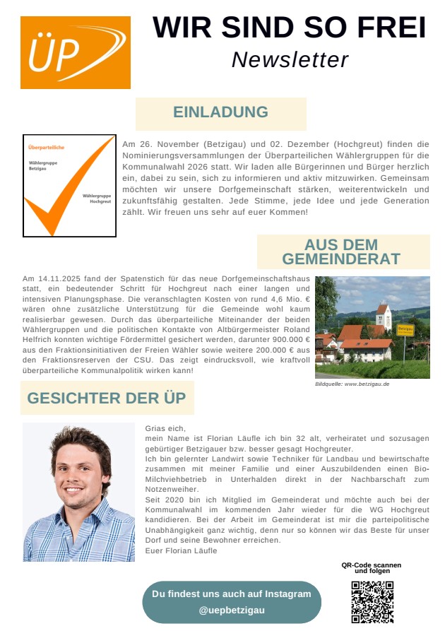 Wenn Sie Interesse an einer parteifreien Mitgestaltung Betzigau’s und seiner vielen Außenbereiche haben, würden wir uns über Ihre Kontaktaufnahme sehr freuen.