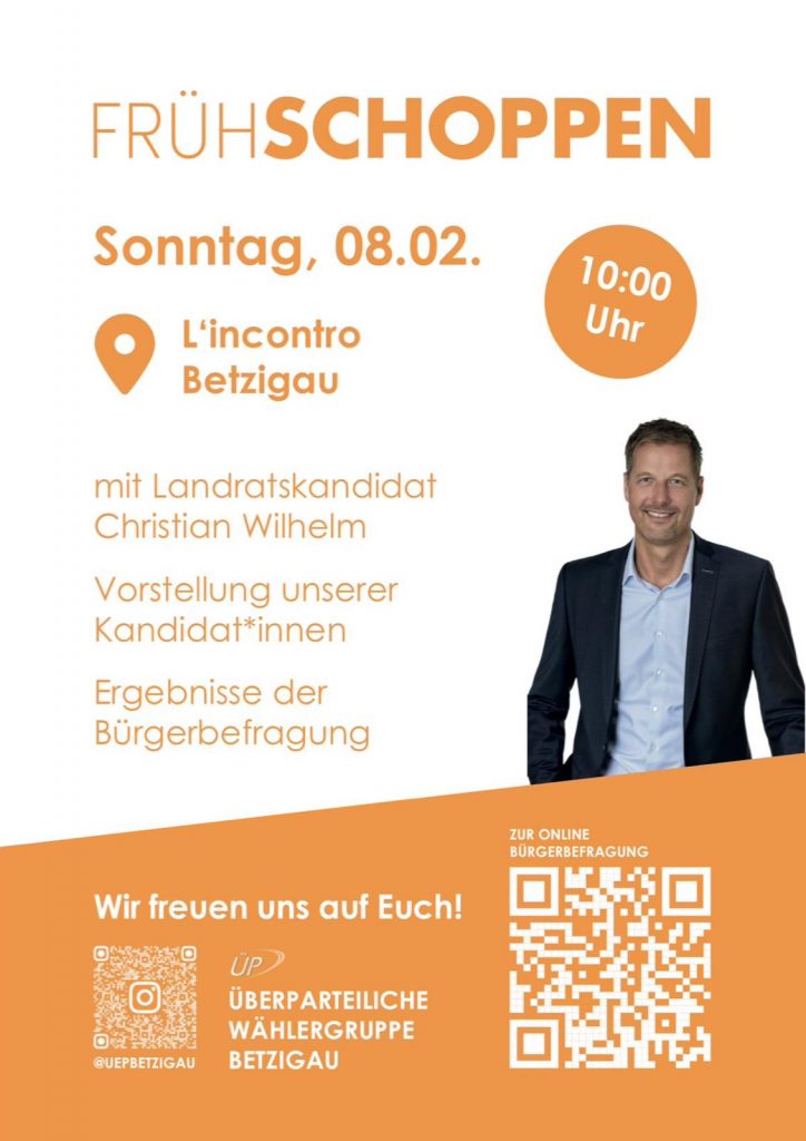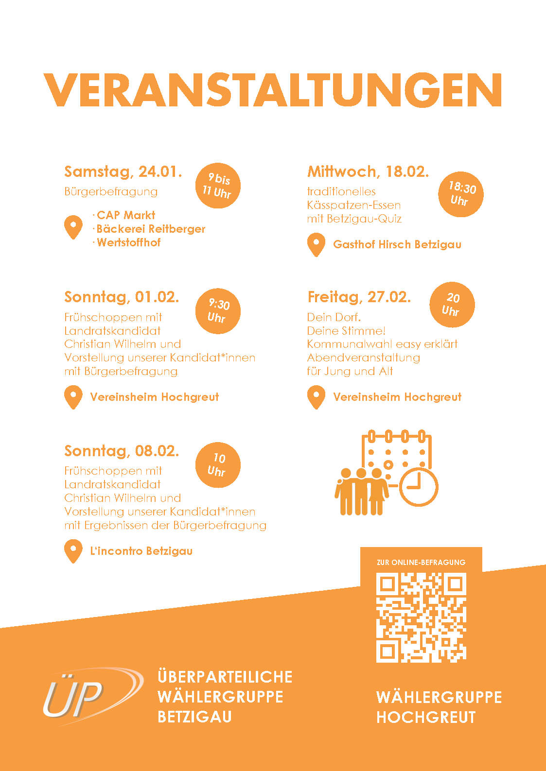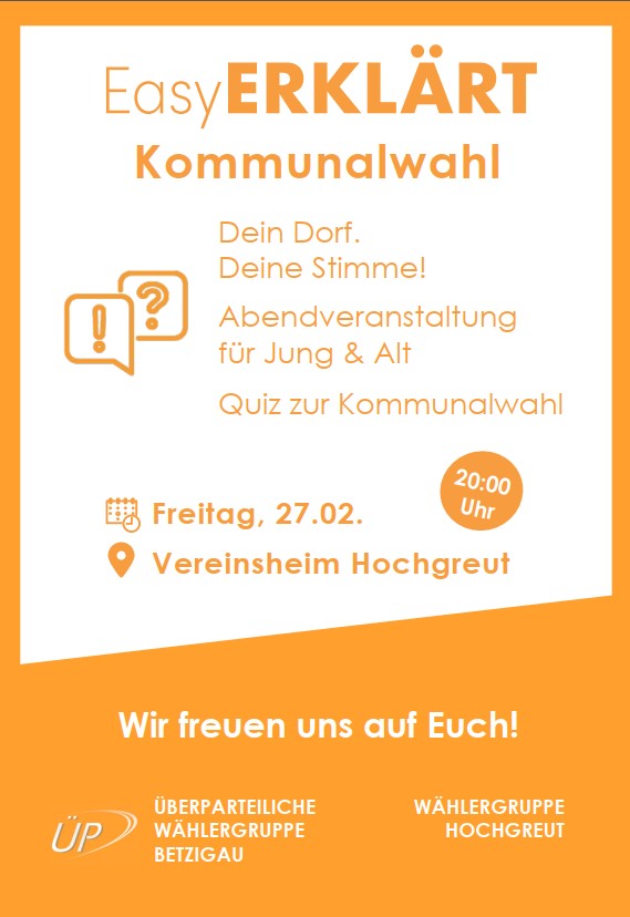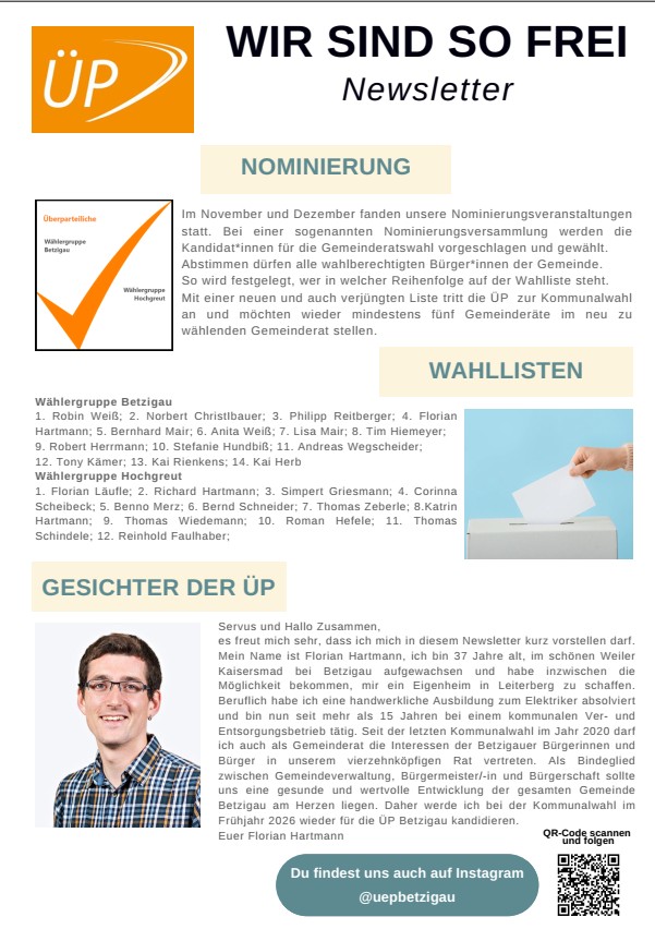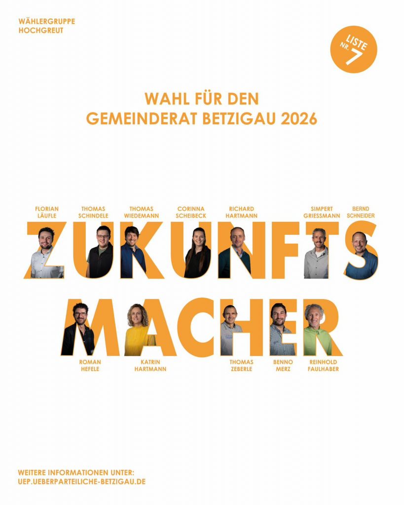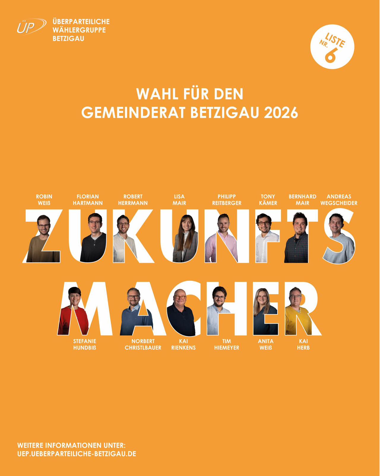 Bitte schenken Sie uns und dieser Überparteilichkeit weiterhin das Vertrauen. Die Kandidatinnen und Kandidaten der ÜP Wählergruppe Betzigau und der Wählergruppe Hochgreut werden Ihr Vertrauen nicht enttäuschen.